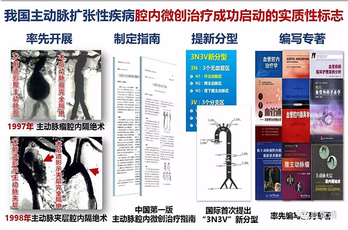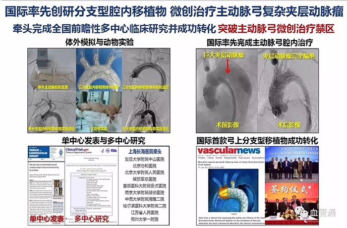 在国际上率先原创地研发出腹主动脉开窗型腔内移植物用于累及内脏分支动脉夹层的腔内微创治疗;将自主研发的世界首款分支型移植物用于主动脉弓夹层的腔内微创治疗;近来,将现有腔内移植物改进成略带锥形的短段型,在国际上率先实现升主动脉夹层的腔内微创治疗。原创、本土、实用的研究论文发表在血管领域顶级杂志JACC(影响因子17.8)上,国际血管外科先驱斯坦福大学Dake教授同期刊发题为“On the Endovascular Climb tothe Type A Dissection Summit, Reaching a New Base Camp”的专文述评,标志着我国在主动脉夹层腔内微创治疗领域已达国际靠前水平。